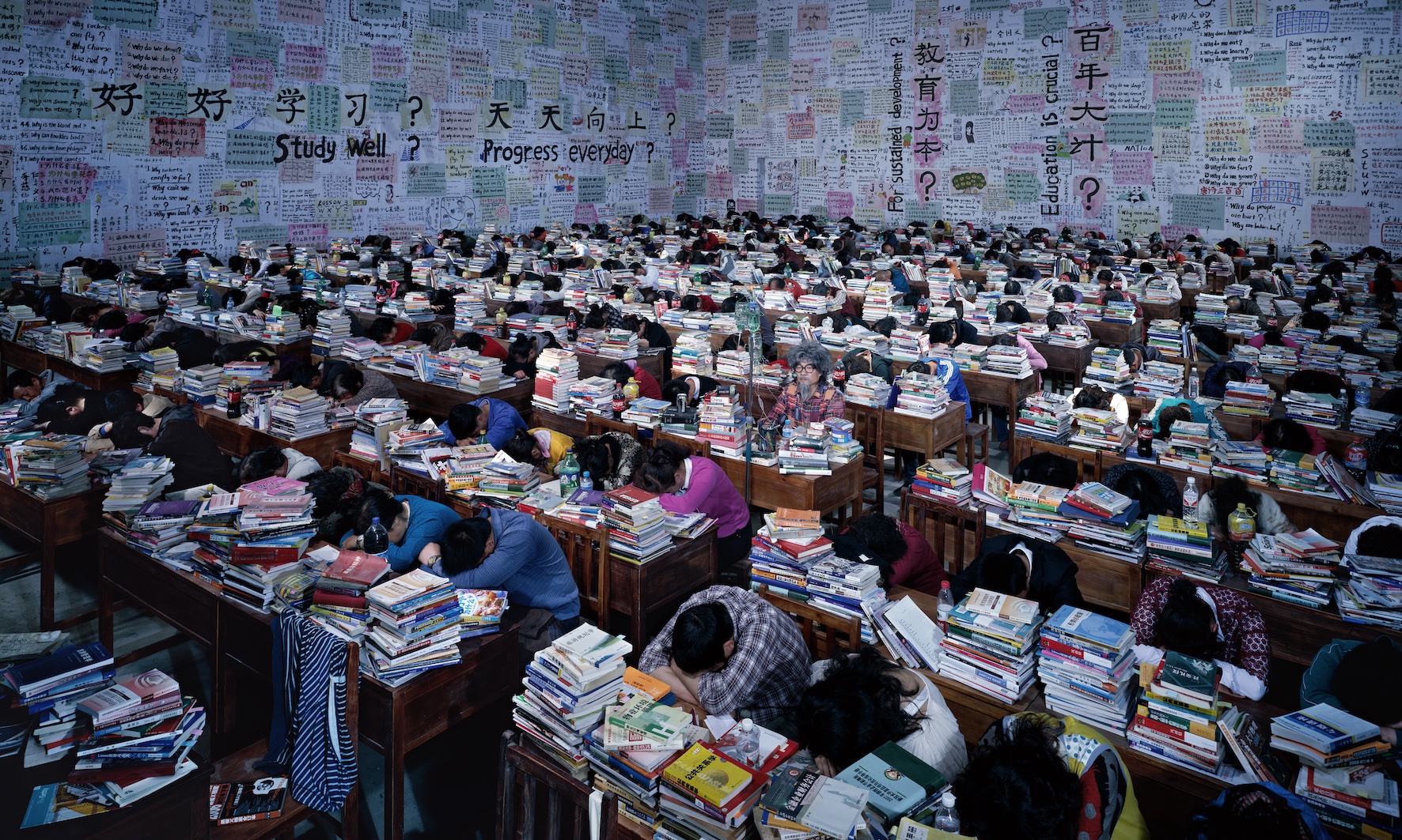 Instead, Wang’s work is immersed in and engaged with the collective drama of Chinese experience. In his most famous work, Follow Me (2003), featured in this first solo exhibition in Australia, Wang documents the drama and ritual of Chinese education. A teacher, played by Wang himself, looks directly at us, implicating us within the authoritarian and difficult hierarchies of the Chinese education system. Wang points to a blackboard with messages in different languages scrawled all over it, the mess of information overwhelming and difficult to comprehend. The image is about the trauma of Chinese education, its mass classrooms also represented in Follow You (2013), with students surrounded by slogans such as ‘Progress every day’ and ‘Study well’ along with existential questions, including ‘Why do we dream?’ and ‘Why do we die?’ This series of classroom works draws upon the trauma that lies in the memories of the hundreds of millions of people who endured it. They turn memories into history while revealing the melancholic sensibility that has hung over national life since the Cultural Revolution of the 1960s and 1970s.